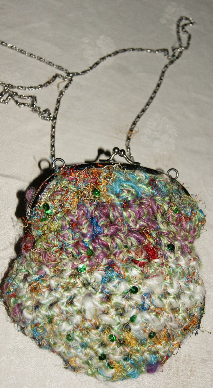 C'est un bien joli nom pour ce joli écheveau filé et teinté par mes soins. Quelques fibres luxueuses et un brin de soie, couleur turquoise. Le voilà transformé en adorable petit sac, doublé d'un voile transparent brodé et d'un pourtour réalisé en dentelle écrue. Tenu par une chaînette pour une mise à l''épaule. J'adore ! et vous ?